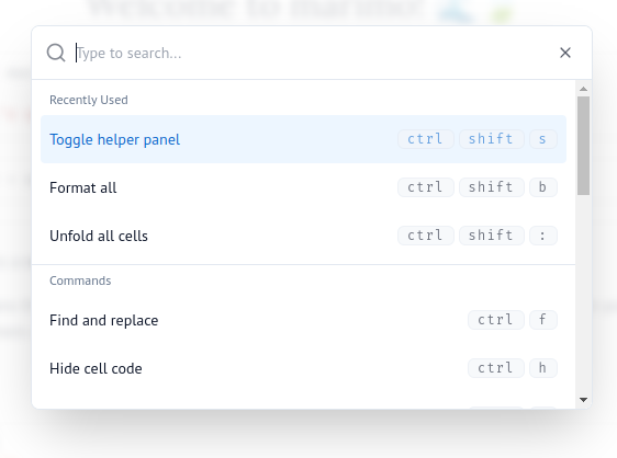 shortcuts for notebooks (Ctrl-Enter, Shift-Enter), dropped others, and added a few of our own. Hit Ctrl/Cmd-Shift-H to pull up the shortcuts.